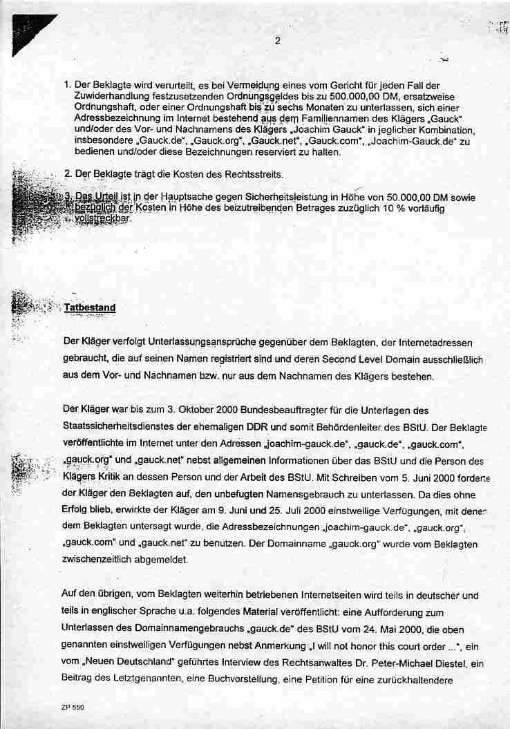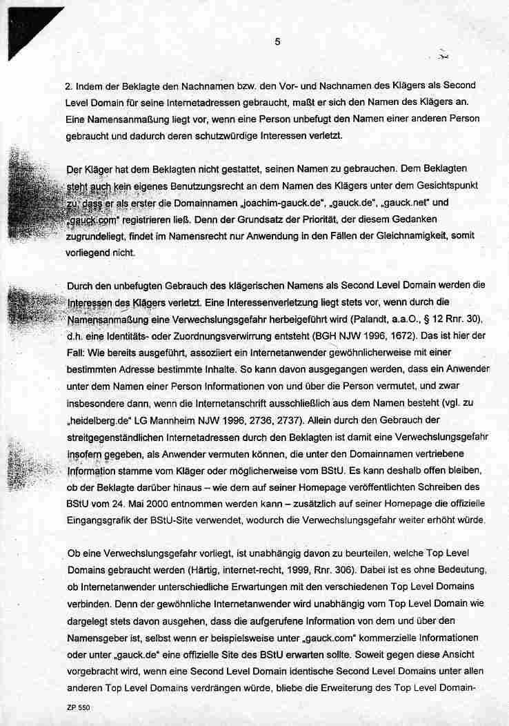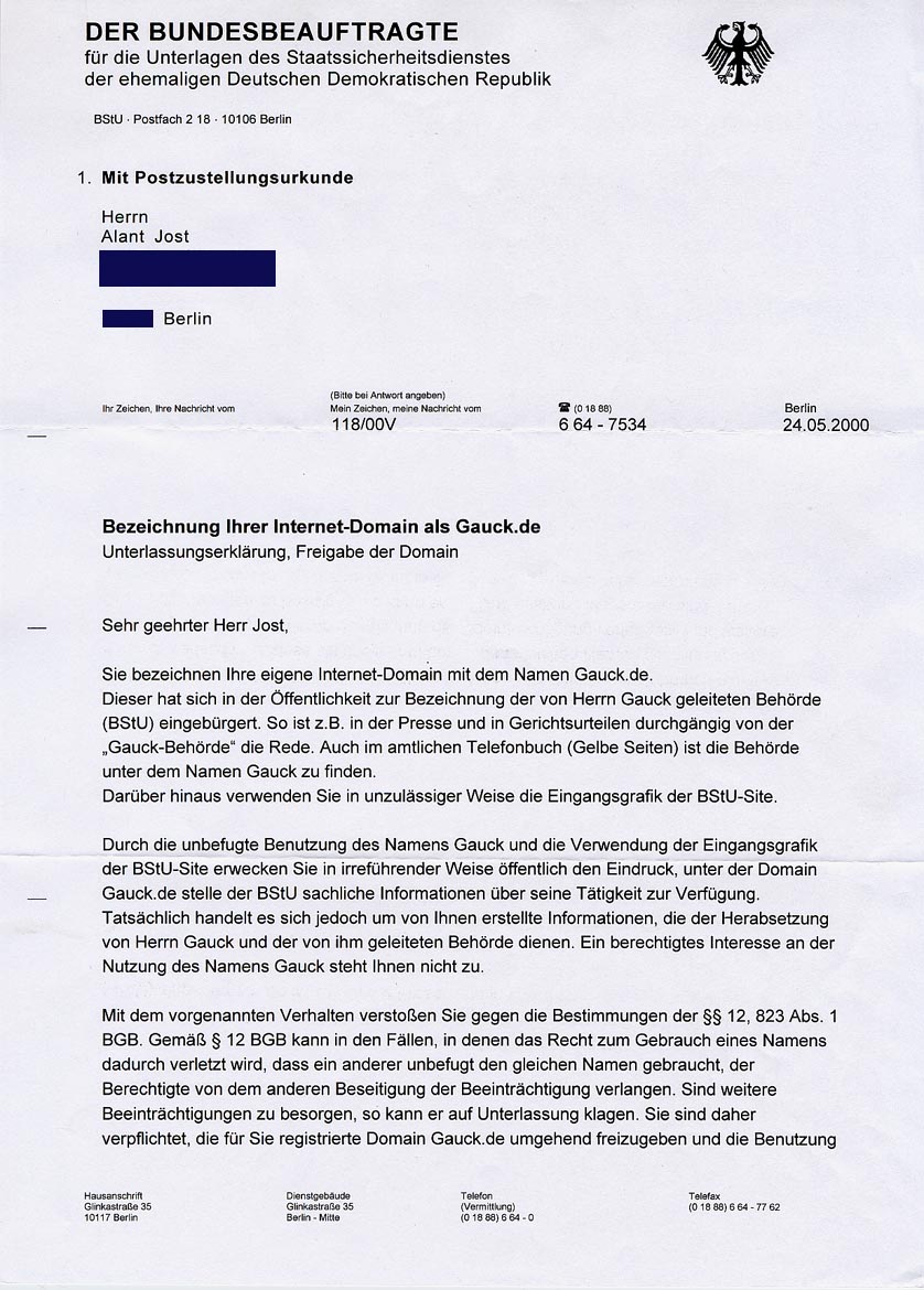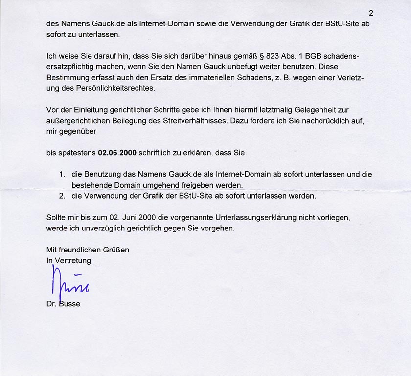 The attempt by the "Gauck-Officials" to assassinate Mr. Gysi politically by struggling to denounce him as a "Stasi spy" led me to acquire the domain name Gauck.de as a means of documenting the Gauck-Officials relentless attempts at destroying him politically. As a result, the German court in Berlin has forbade me to register or use ANY TOP LEVEL domain with "Gauck" in it. Since, I will not voluntary relent my right to protest in this way, I am forced to carry many thousands of Marks of lawyer's fees, and face penalties from the state and possible imprisonment. The ruling by the court effectively sets a precedent that would allow Hitler (if he were living today) to outlaw a critique of his politics using a domain name such as Hilter.de, Hitler.com, Hitler.org, Hitler.net, Hitler.co.il (domain for Israel), or any possible combination of Hilter.xxx or Adolf-Hitler.xxx. This ruling is not only a violation of my intellectual property rights, but an attempt to curtail dissent and free speech.