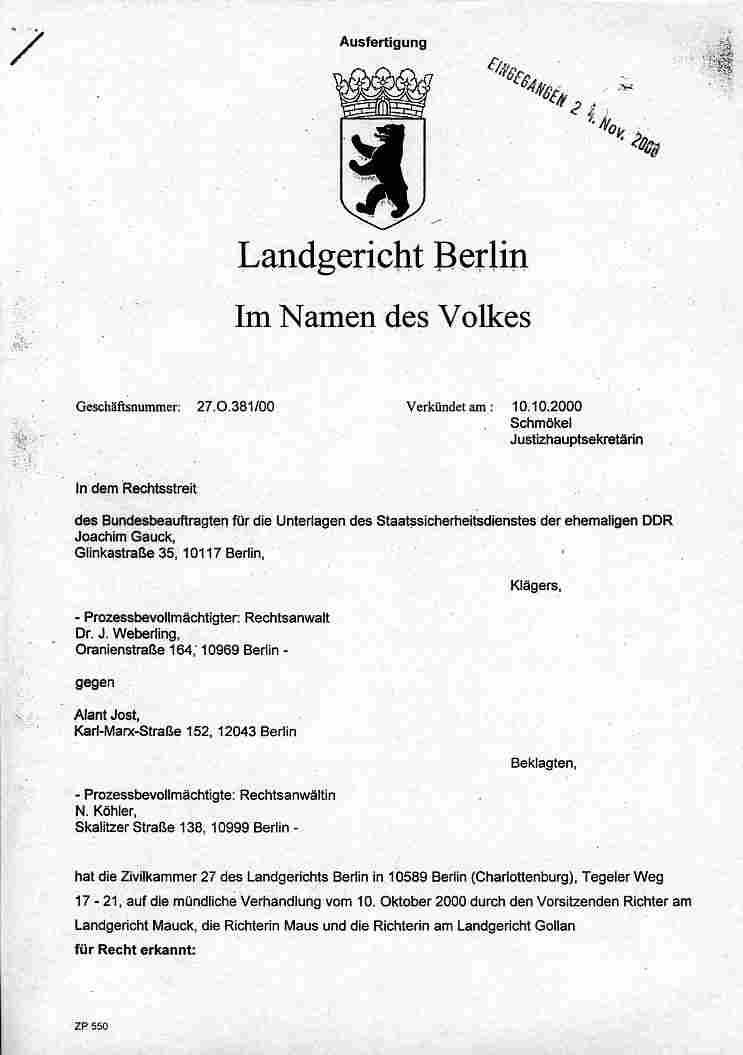 Entscheidung des Landgerichts Berlin für Joachim Gauck und gegen Alant Jost