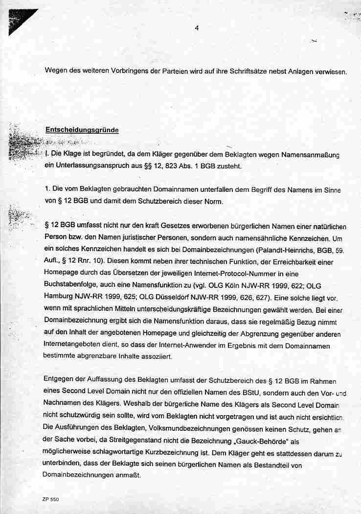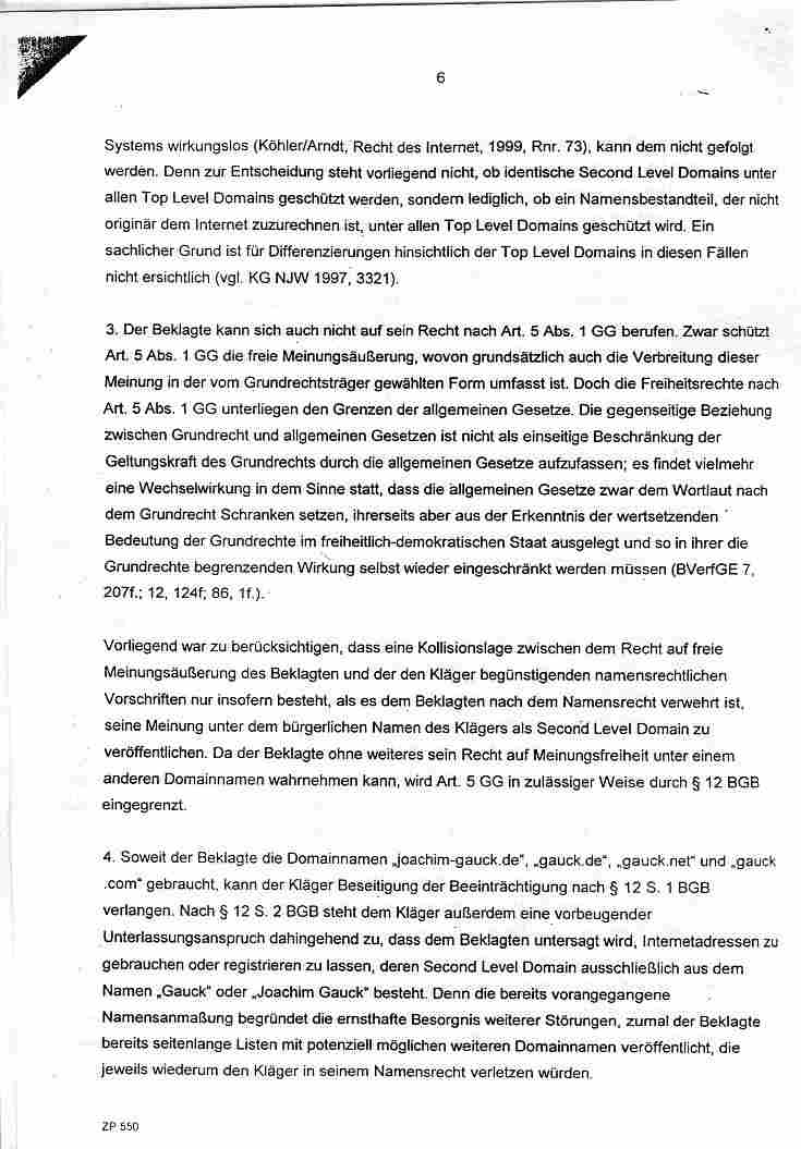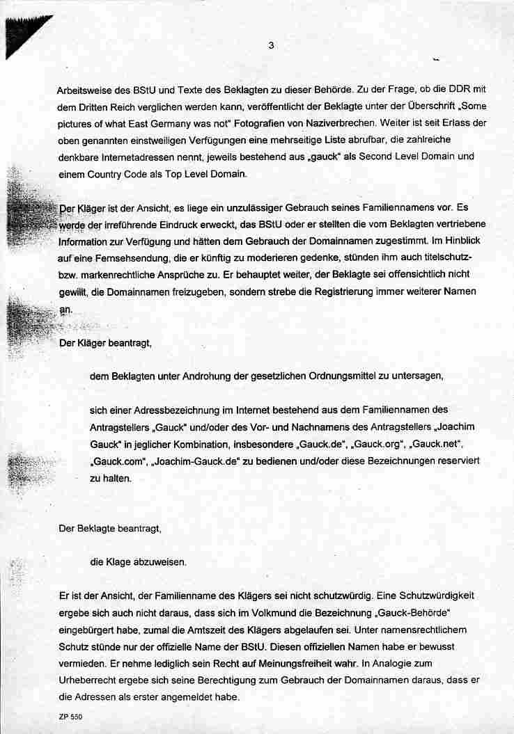 The attempt by the "Gauck-Commission" to assassinate Mr. Gysi (a Jew who had 18 of his family members murdered by the NAZIS) politically by struggling to denounce him as a "Stasi spy" led me to acquire the domain name Gauck.de as a means of documenting the Gauck-Commission's relentless attempts at destroying him politically. As a result, the German court in Berlin has forbade me to register or use ANY TOP LEVEL domain with "Gauck" in it. Since, I will not voluntary relent my right to protest in this way, I am forced to carry many thousands of Marks of lawyer's fees, and face penalties from the state and possible imprisonment. The ruling by the court effectively sets a precedent that would allow Hitler (if he were living today) to outlaw a critique of his politics by using a domain name such as Hilter.de, Hitler.com, Hitler.org, Hitler.net, Hitler.co.il (domain for Israel), or any possible combination of www.Hitler.xxx or www.Adolf-Hitler.xxx.